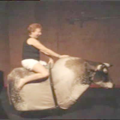 Woman falls off a mechanical bull as soon as it starts to buck. Short clip.