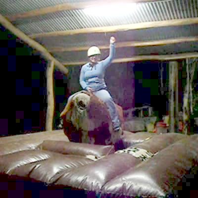 A mechanical bull moves as soon as a woman jumps onto it and the bull throws her off. Featured talent cleared only (woman jumping on the bull).