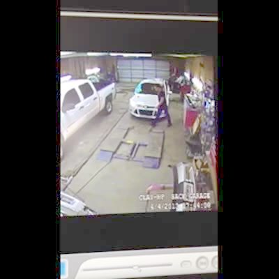A man trips and falls while walking in a mechanic's garage, hitting his head. Recorded from secondary source.