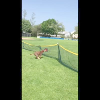 A dog runs into a mesh fence when it tries to jump over. Slow motion.
