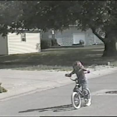 Young girl learns how to ride a bike. She keeps getting mad at the bike. She kicks it, bites the tire and yells at her little sister for messing her up