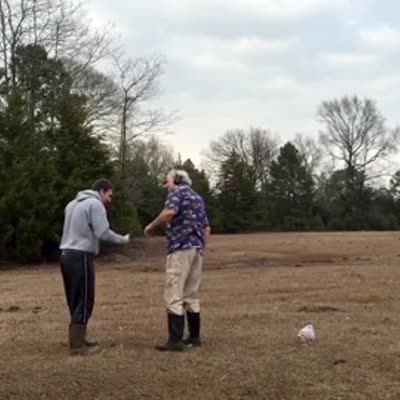 A man stands with a rifle in a field to shoot skeet and another man throws the disk, but messes up the throw and accidentally hits him in the head with it.