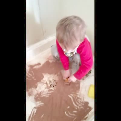 A tot boy plays with sand in a shower. His mother films and asks what he is doing. She asks if it is sand. Then she says "It kinda looks like it is Nesquik" and holds up the empty box. She says, "This is what Mommy gets for trying to vacuum the floor while you are awake."