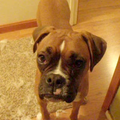 Brown boxer dog has chewed up a pillow and left the stuffing all over the floor. Room is dark, camera pans to guilty looking dog. Mess.