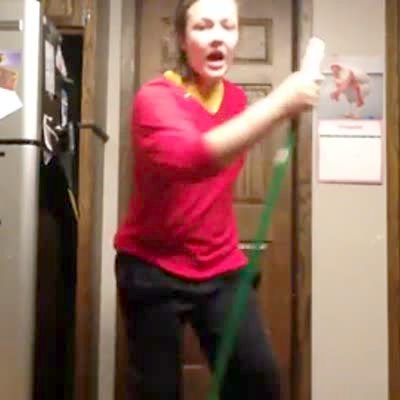 A teen girl dances with a broom in the kitchen as she uses it like a microphone stand. She puts the broom between her legs, then trips and falls.