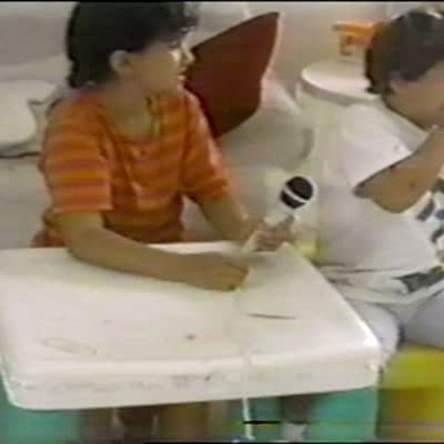 A girl holds her baby brother in a living room. She holds him up to a microphone and asks if he has anything to say. He throws up all over the microphone. Short heads. Caucasian.