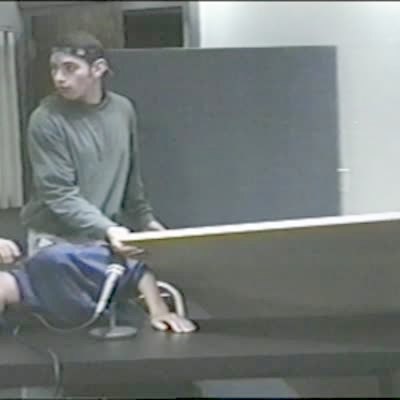 Backdrop wall falls on boy's head as he sits talking into a microphone