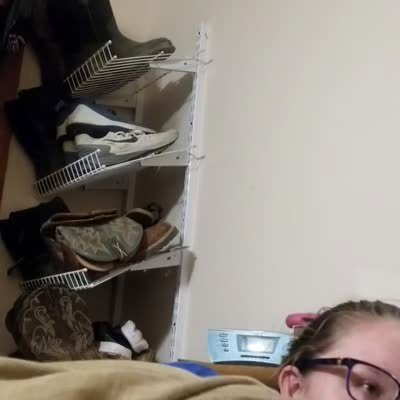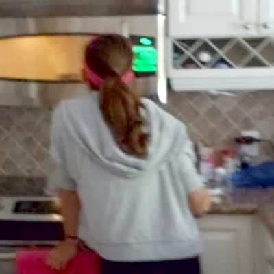 A teen girl climbs up on the kitchen counter and pretends to sing into a wooden spoon. She falls and her shorts get caught on a cabinet pull and she hangs upside down and then falls on the floor. TikTok video.