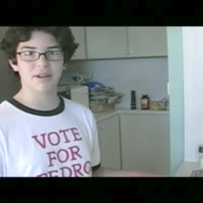 A woman and a young boy do the tortilla slap challenge in a kitchen. The woman loses "Rock Paper Scissors," then spits her water in the young boy's face before he can hit her.