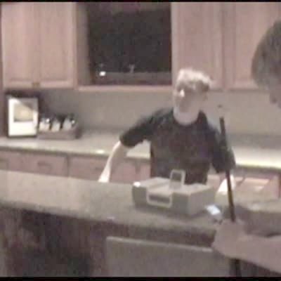 Teen boy dances on bar in the kitchen, he tries to jump to the opposite counter, he falls and hits microwave. Bonehead.