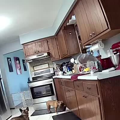 A teen girl takes a drink out of the microwave and pours it into another cup, but she and a French bulldog dog both jump when it explodes. Security footage.