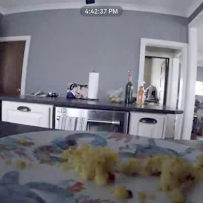 An Australian Shepherd dog eats food off of a plate on a kitchen counter. He then uses his paw to turn the camera away. Security footage. No audio.