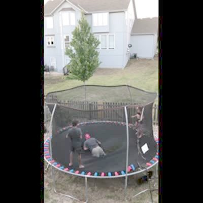 A teen boy jumps on a trampoline in a yard and tries to land on his butt, but the trampoline splits down the middle when he lands on it.