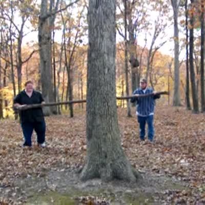 Two men hold either end of a long log and run at a tree. The middle of the log hits the tree, and one end flies up, hitting one of the men in the face. Boneheads.