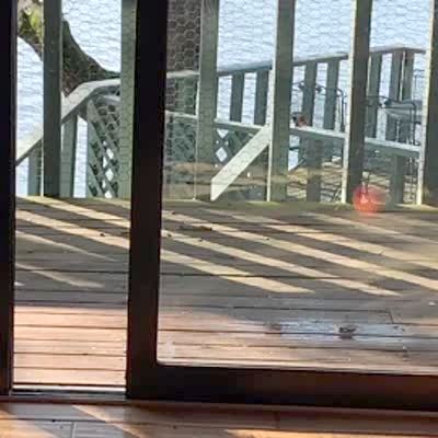 A Puppy dog whines and scratches at a two glass back doors repeatedly and does not see the crack open in the middle. A man and a woman call him inside repeatedly and laugh.