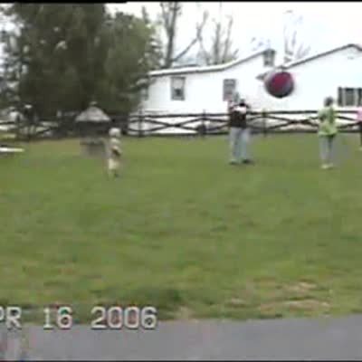 Family plays kickball, tot boy runs through the middle of the game and gets hit in the head by the ball. He falls down. No recovery, camera cuts off.