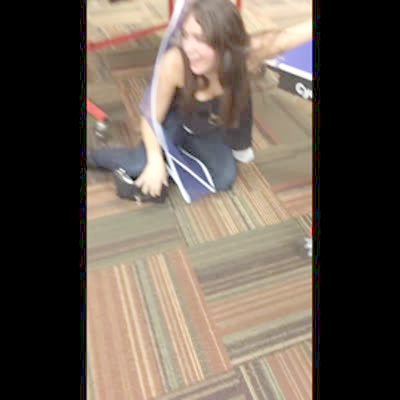 A man sits in an office chair in the middle of the living-room and leans back and the back breaks and he falls. Security footage.
