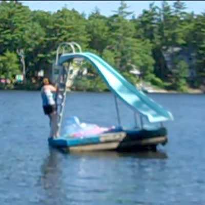 Woman tries to climb a ladder on an inflatable slide in the middle of a lake. The ladder breaks and the woman falls in the water. (2103)
