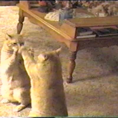 Two cats stand on their back legs and touch their front paws together, like a mirror image copying each other. Mimic. Move in synch .