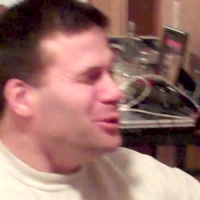 Man with flashlight outside at night makes a high pitched whirling noise. Nearby frog makes same noise / returns the call, man shines flashlight on it and they mimic each other.