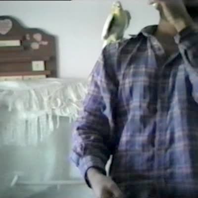 A young girl mirrors a man's movements for one hundred dollars at the kitchen table. The man sips the water out of the cup then spits it out later and the girl spits simultaneously to win the money.