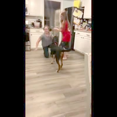 Two young girls pretend to fight in the kitchen, one of them falls on purpose to play dead and their dog copies her while he watches.