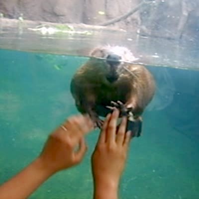 little girl at a zoo stands in front of a tank with a beaver in it. the girl puts her hands to the glass and moves then like she was paddling. the beaver mimics her moves.