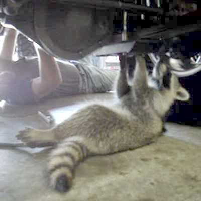 Man lays on garage floor and works under his Jeep. A raccoon also lays on the floor and mimics man. Strange visual. Odd.