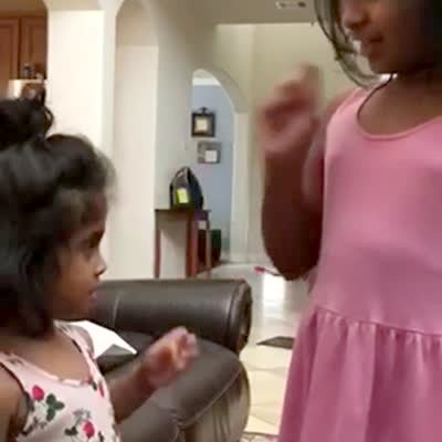 A young girl recites the Peter Piper tongue twister for her tot sister in the living room. The tot girl babbles as she repeats the tongues twister with the same intonation as her sister.