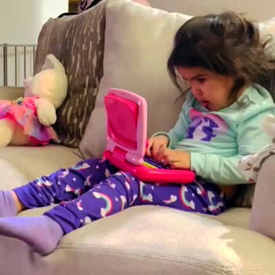 A young girl plays with a toy computer and pretends to be her mother and has a conversation with herself and asks for things and says "just a second" and types on the keyboard in the living-room.