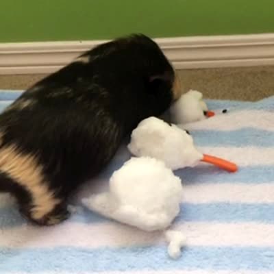 A guinea pig knocks over a mini snowman and eats its carrot arms.