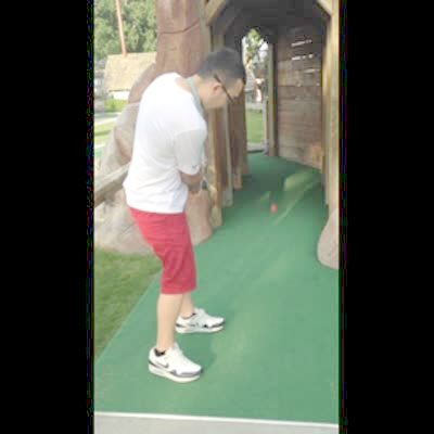 Tot boy playing mini golf. He falls backwards into the bushes. With recovery