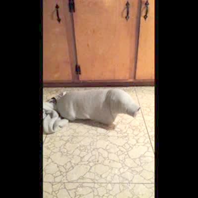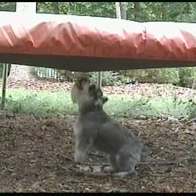 "The Terrier, The Turtle, & The Trampoline" Mini schnauzer dog jumps underneath a trampoline to hit a turtle that's on top. Turtle bounces & flips over.