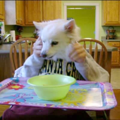 Mini eskimo spitz dog's head sticks out of a sweater as a person's hands put food in its mouth at a dining room table.