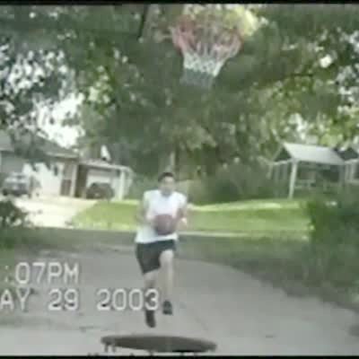 Teen boy jumps off mini trampoline to dunk basketball. Trampoline collapses & flips over, teen falls on his butt. Driveway, stunt, trick.