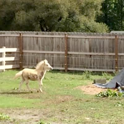 A young boy leads a mini horse around an obstacle course. The horse jumps over obstacle course and pulls the young boy to the ground. Music rights not cleared.