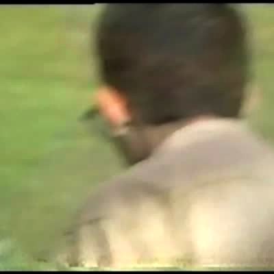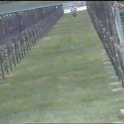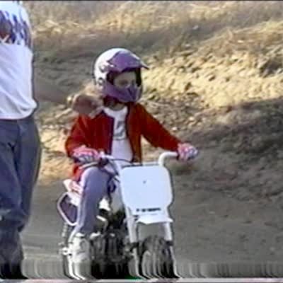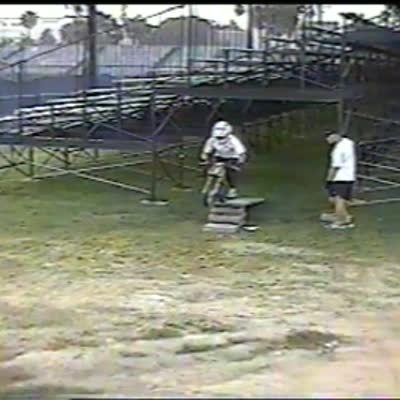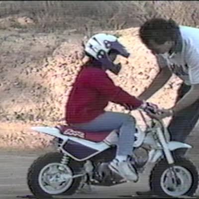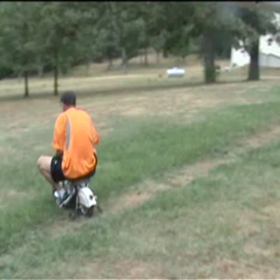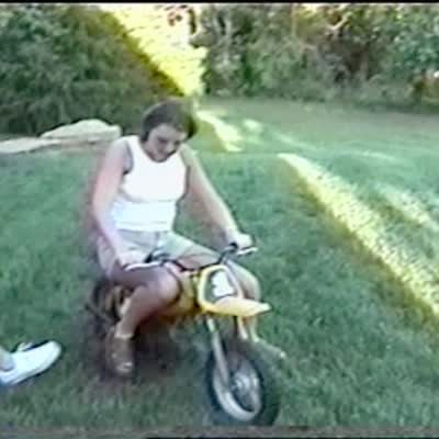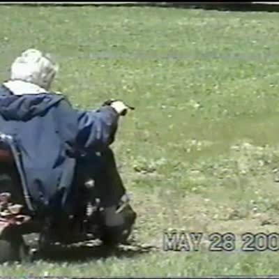 Senior woman riding on a mini bike crashes into a tree. Date on screen 2004.