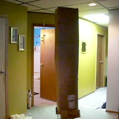 Two young brothers kick a large rubber ball around in the garage and the older boy kicks it too hard and it hits a light fixture and knocks a fluorescent bulb out and it shatters on the floor. The boys back away in shock and the ball bounces and pops loudly and the older boy says "whose fault was that?" Security footage