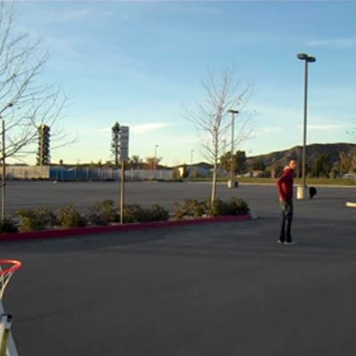 A man looks into the camera and throws a rubber ball over his shoulder and the ball hits the roof and rolls off, bouncing off a mini-trampoline, and goes into a basketball net on the lawn.