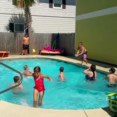 A group of kids stand on the edge of a pool and throw the ball back and forth as they jump into the pool one by one, and the last one dunks the ball into the mini hoop, outdoors.