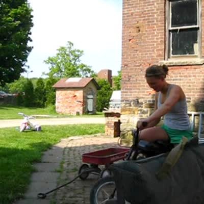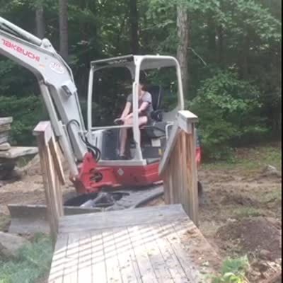 A woman, riding a mini excavator, is told to stay away from the stairs right before she runs into them with the excavator outdoors.