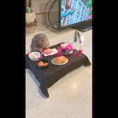 A hamster sits at a mini table in the living room and eats food off small plates. AA: hamsters eating