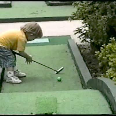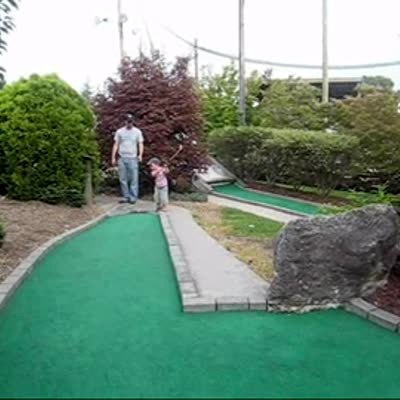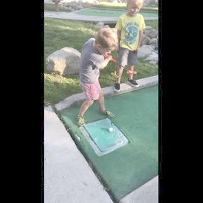 Tot boy swings at mini golf course, misses several times, makes a hole in one when he finally hits it.