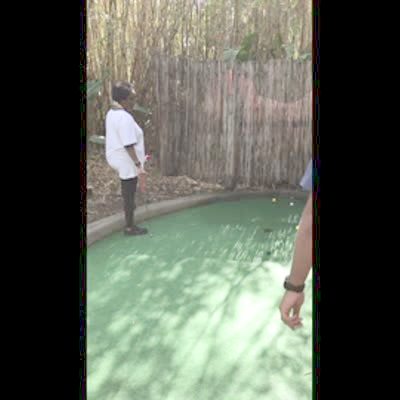 A teen boy hits a shot in mini golf and the ball bounces back and hits him in the face.