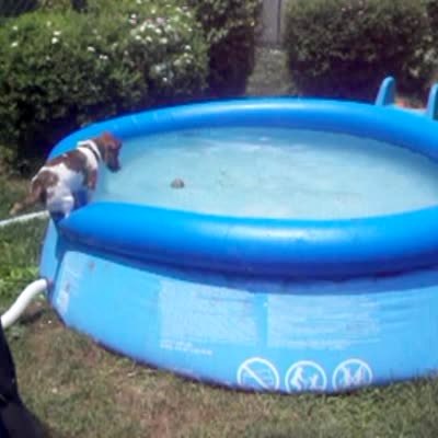 Jack Russell terrier dog shuffles around on rim of mini pool in yard trying to get ball, eventually falls in.
