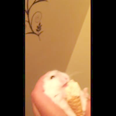 A hamster licks ice cream out of a mini ice cream cone in the living room. AA: hamsters eating