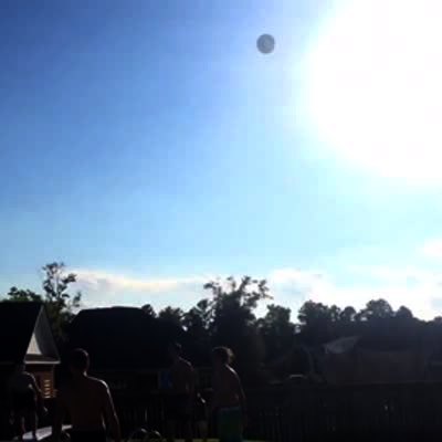 "Tremendously Timed Trick Shot" A teen boy on a trampoline throws a ball to a group of teen boys next to a pool, who throw it from one to the other as they all jump in the pool, before one dunks the ball in a mini hoop, outdoors. AA: Basketball Trick Shots.