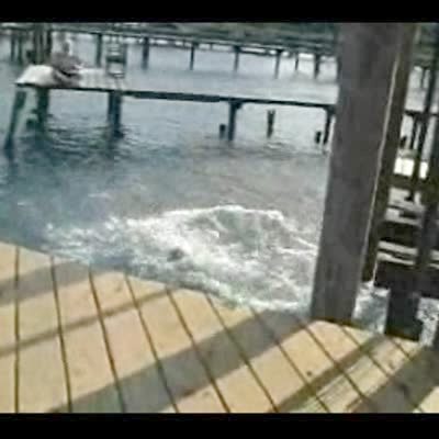 Mom rides a mini bike down a pier at the lake and can't stop at the end of the dock, she falls into the water with the bicycle. Bonehead. Possible set up.