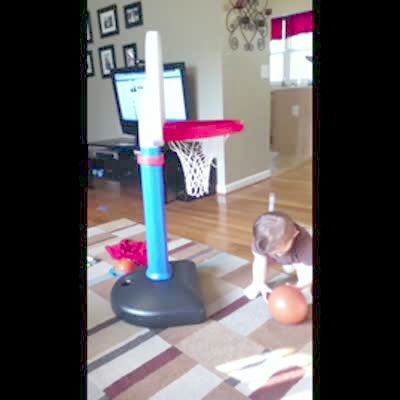 Tot boy plays on mini basketball hoop in living room, makes over-the-head shot without looking.