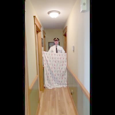 A man in a pilot's uniform in a hallway does the What the Fluff challenge and disappears and a young boy wearing pilot's uniform appears.
